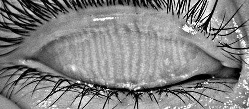 瞼板腺在眼皮下面,翻開眼皮后就能看到一條條瞼板腺整齊地排列著。