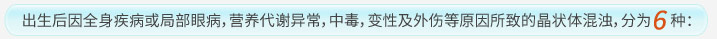 又叫發(fā)育性白內(nèi)障,多在出生前后即已存在,多為靜止型,可伴有遺傳性疾病,有內(nèi)生性與外生性兩類,內(nèi)生性者與胎兒發(fā)育障礙有關(guān),外生性者是母體或胎兒的全身病變對(duì)晶狀體造成損害所致。