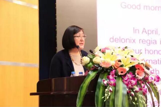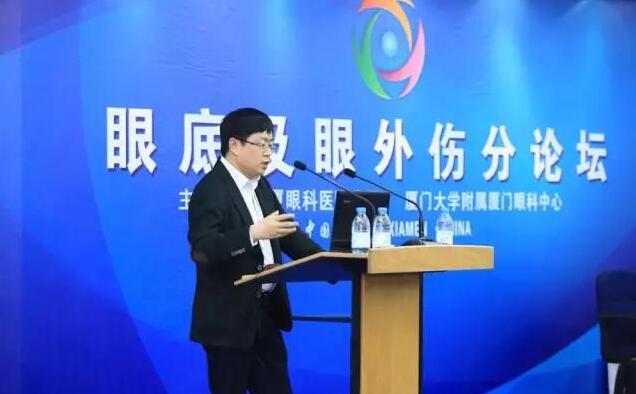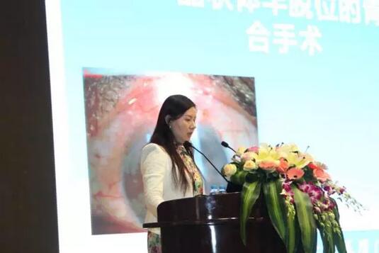 廈門大學(xué)附屬?gòu)B門眼科中心眼外傷學(xué)科帶頭人蔡錦紅主任在做“脈絡(luò)膜上腔出血的臨床治療選擇”報(bào)告。