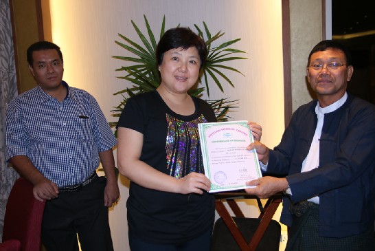 緬甸執(zhí)政黨、緬甸鞏固和發(fā)展黨中央常委、仰光地區(qū)黨部主席、仰光前任市長U Aung Thein Lin先生向廈門眼科中心李立梅博士頒發(fā)證書