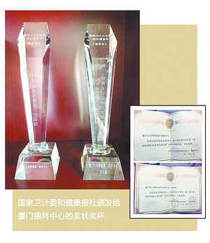 國家衛(wèi)計(jì)委和健康報(bào)社頒發(fā)給廈門眼科中心的獎(jiǎng)狀和獎(jiǎng)杯。
