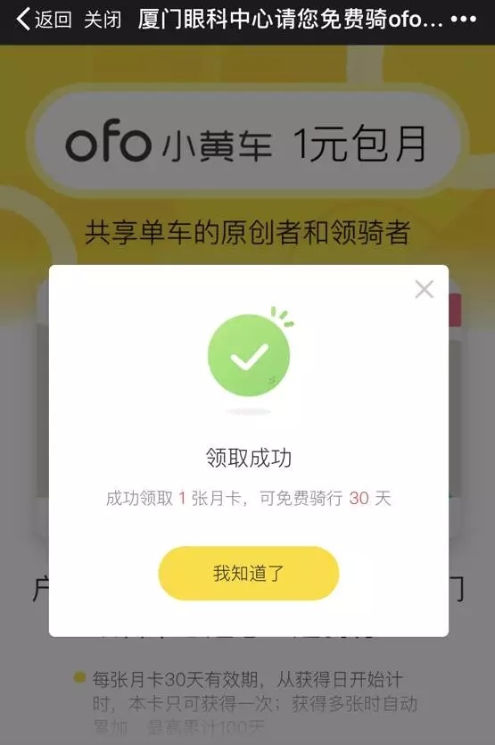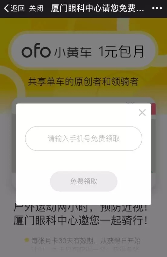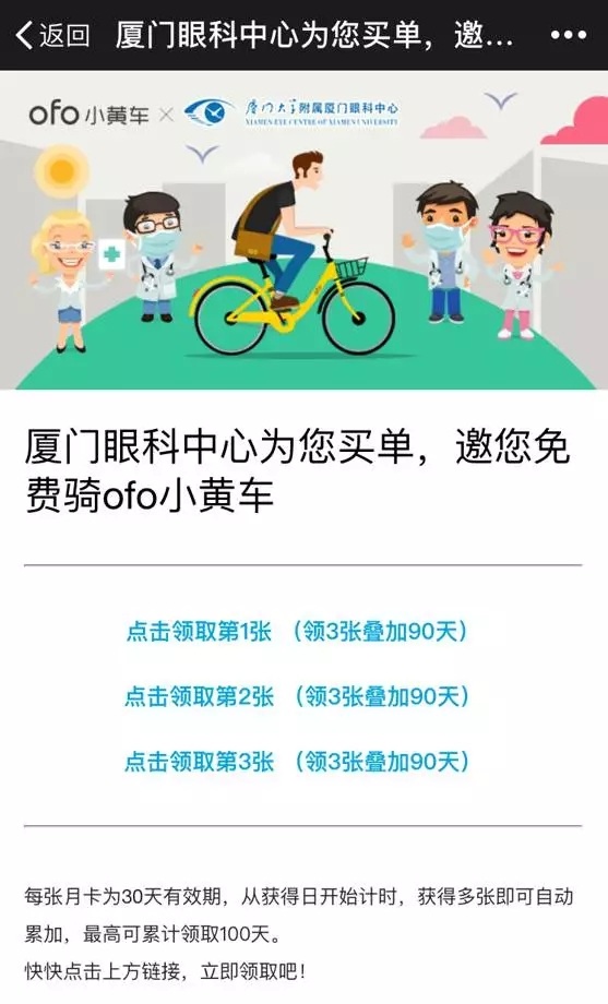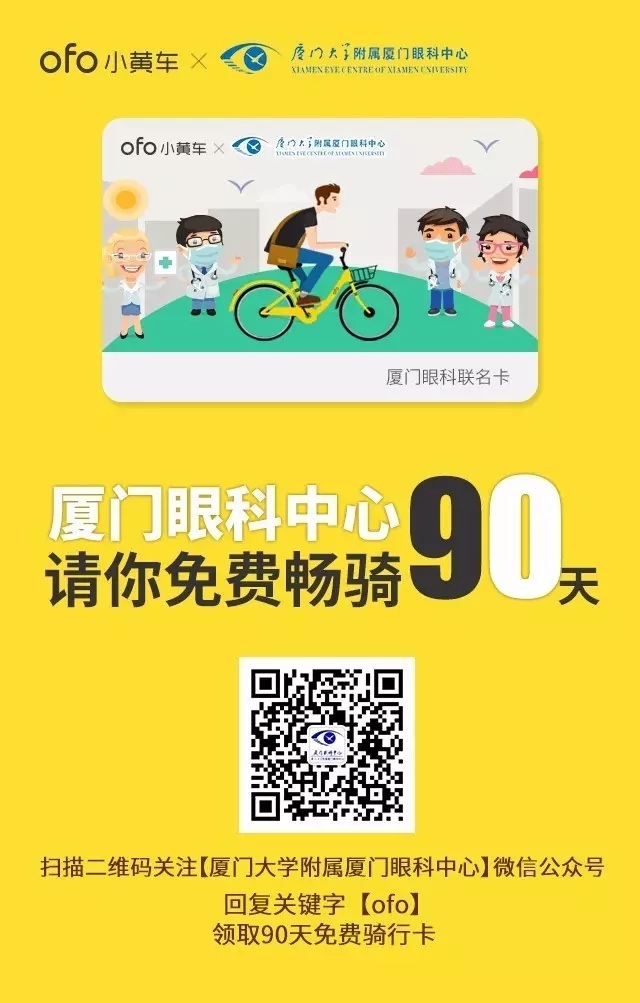 關(guān)注廈門大學(xué)附屬廈門眼科中心微信公眾號(xmyanke),回復(fù)ofo,點擊鏈接領(lǐng)卡;或者直接點擊【關(guān)于我們】→【免費(fèi)騎行】參與活動。