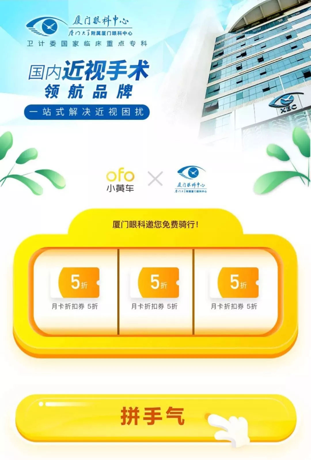 來吧,心動(dòng)不如行動(dòng)!廈門眼科中心· ofo小黃車拼手氣免費(fèi)月卡活動(dòng)再次來襲,滿足你關(guān)于旅行的所有想象!