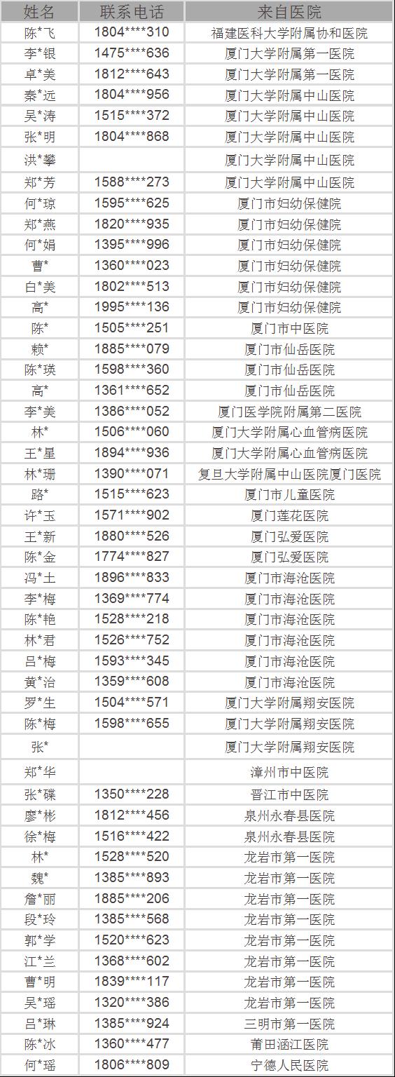經(jīng)過審核完成后,廈門13家醫(yī)院34名醫(yī)護(hù)人員、福州1家醫(yī)院1名醫(yī)護(hù)人員、漳州1家醫(yī)院1名醫(yī)護(hù)人員、泉州2家醫(yī)院3名醫(yī)護(hù)人員、龍巖1家醫(yī)院8名醫(yī)護(hù)人員、三明1家醫(yī)院1名醫(yī)護(hù)人員、莆田1家醫(yī)院1名醫(yī)護(hù)人員、寧德1家醫(yī)院1名醫(yī)護(hù)人員獲得了免費(fèi)手術(shù)資格。名單公示如下: