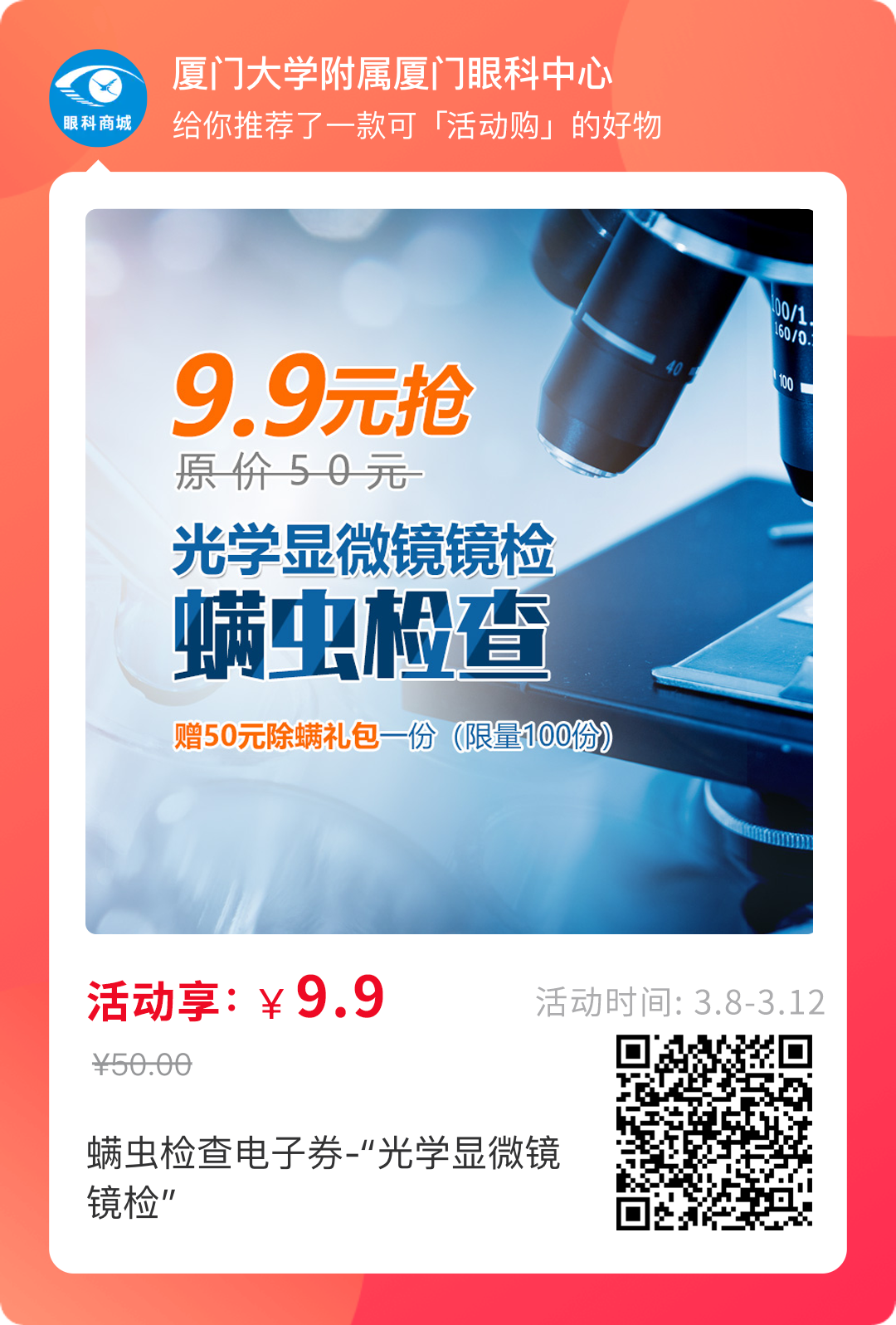 1、活動(dòng)期間,9.9元即可享50元“光學(xué)顯微鏡鏡檢”螨蟲檢查;