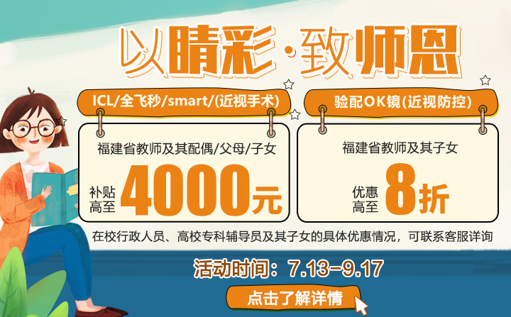 福建省教師及其配偶、父母、子女:ICL/全飛秒/Smart 享有減免優(yōu)惠 4000 元。