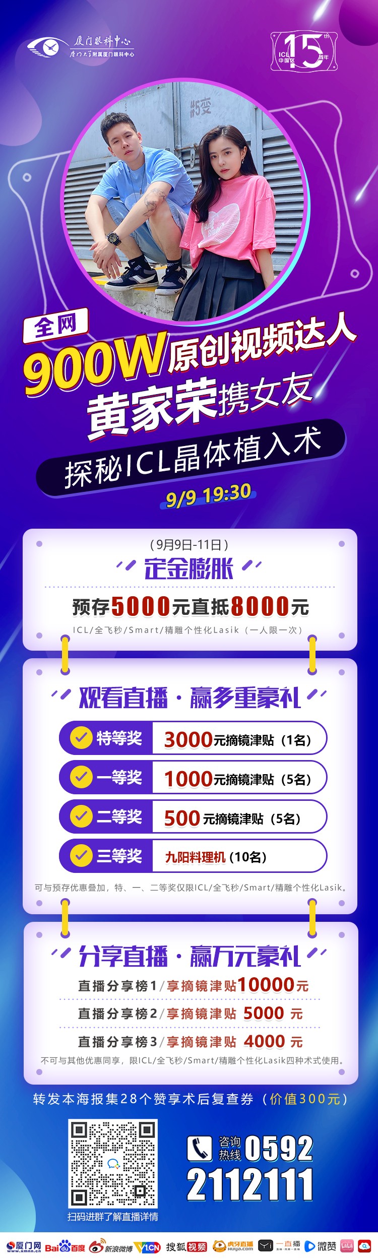 所以——摘鏡嗎?摘鏡!9月9日19:30,黃家榮將攜女友小山楂,和廈門(mén)眼科中心陳亮副主任一起為大家展示ICL手術(shù)全過(guò)程,直播期間,還會(huì)為大家?guī)?lái)多多的摘鏡福利哦
