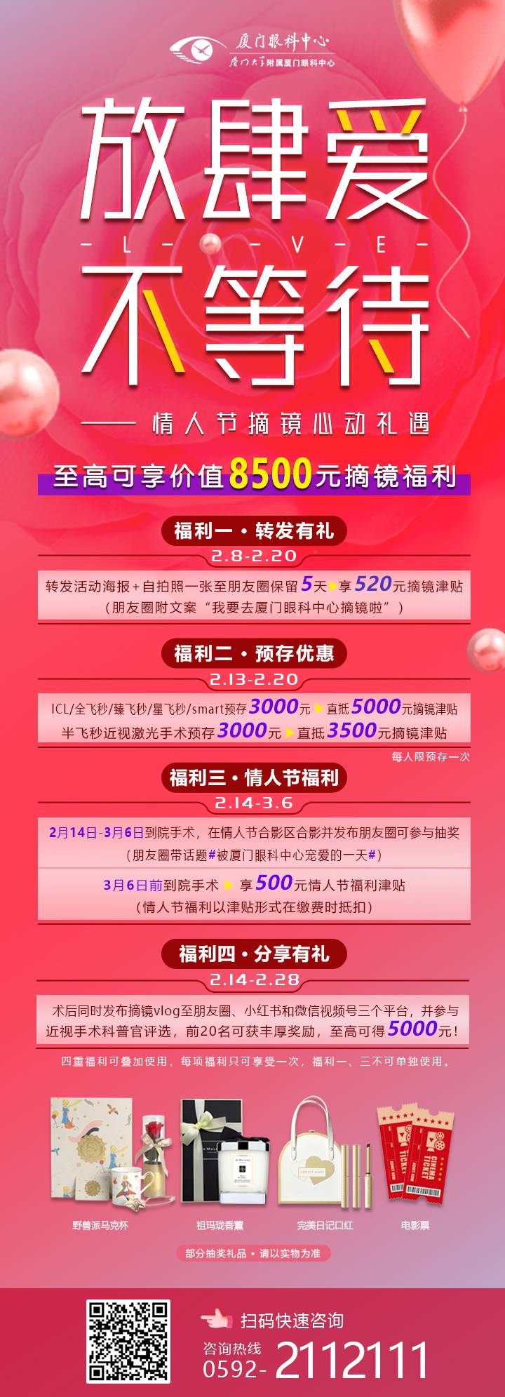 2月14日-3月6日前到院手術(shù),在屈光中心情人節(jié)布景區(qū)合影并帶話題#被廈門眼科中心寵愛的一天#,發(fā)布至朋友圈即可參與抽獎。