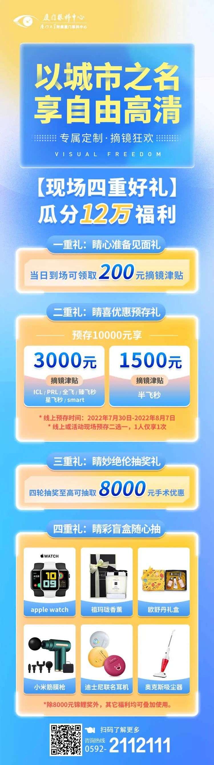 現(xiàn)場(chǎng)預(yù)存10000元,ICL/PRL/全飛秒/臻飛秒/星飛秒/Smart 即享3000元摘鏡津貼;半飛秒享1500元摘貼。