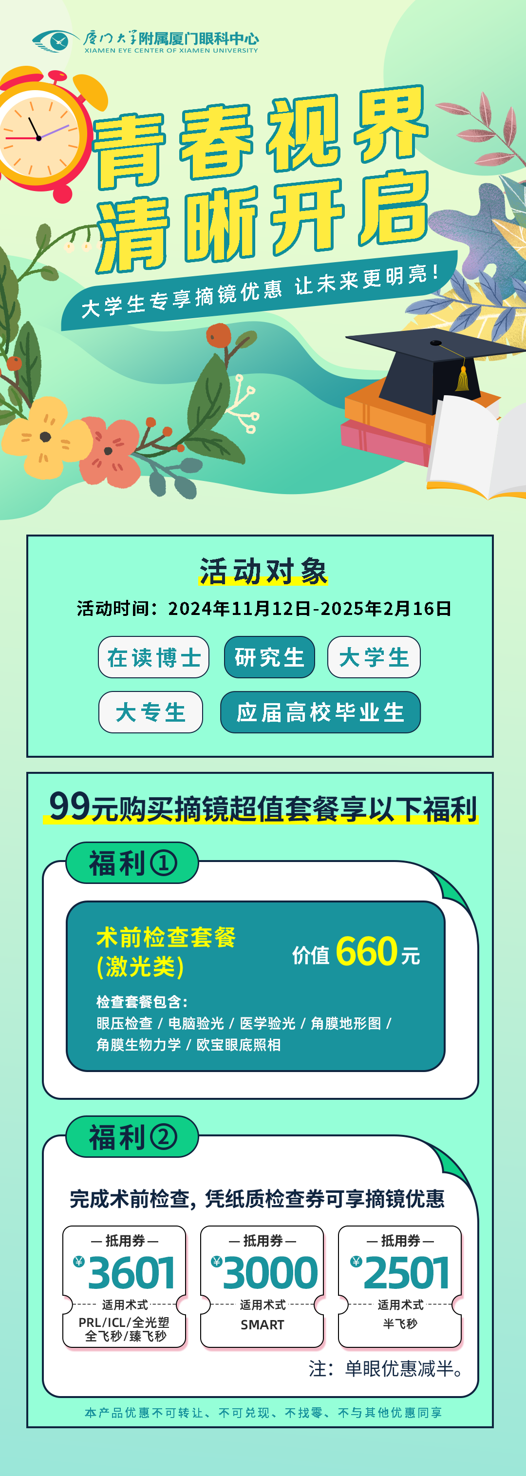 以上就是關(guān)于“2024福建大學(xué)生做近視手術(shù)有優(yōu)惠嗎”問(wèn)題的詳細(xì)內(nèi)容,如果你是大學(xué)生,想要擺脫眼鏡的束縛,不妨抓住這次的機(jī)會(huì),到廈門眼科中心進(jìn)行詳細(xì)咨詢和術(shù)前檢查,選擇適合自己的近視手術(shù)方式,開(kāi)啟清晰的新世界。