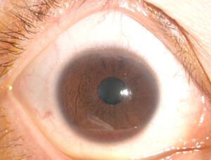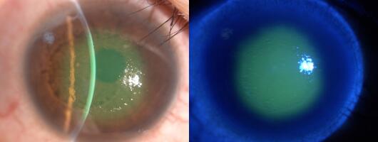 王女士回家后趕緊滴了眼藥水,未想第二天右眼疼痛更加明顯,已無法正常睜眼,視力也降到只有眼前手動(dòng)。這下王女士慌了神,決定還是到正規(guī)??漆t(yī)院看病為好,經(jīng)人介紹,王女士來到廈門眼科中心找到修陽暉博士就診。經(jīng)過詳細(xì)的檢查后,修陽暉博士發(fā)現(xiàn)王女士患上了嚴(yán)重的角膜炎,中央?yún)^(qū)角膜已大部分受綠膿桿菌感染及浸潤。