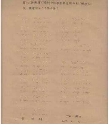 近日,廈門眼科中心眼底二病區(qū)的醫(yī)生護(hù)士們收到了一封特殊的感謝信。感謝信上每個(gè)醫(yī)生護(hù)士的名字,都是用盲文打出來的,下排還用鉛筆標(biāo)注了拼音,仔細(xì)拼讀才知道這是一列醫(yī)生名單:黎曉新、吳國基...