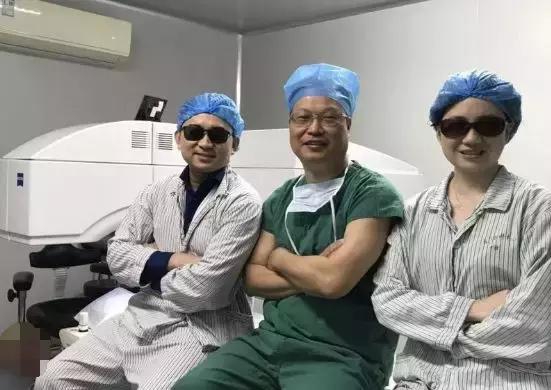 ▲柯壽濤(左)、孔潔(右)剛剛做完近視手術(shù)后與沈政偉院長合影留念