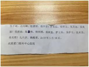 爺爺遞給廈門眼科中心白內(nèi)障科室陳偉主任及醫(yī)護人員的紙條