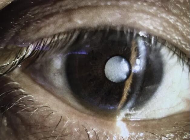廈門眼科中心的陳偉主任和何雪洪副主任為他做了詳細(xì)的檢查,結(jié)果讓他大吃一驚。細(xì)致的陳偉主任發(fā)現(xiàn),他角膜鼻下方有一陳舊性縱向穿通性疤痕,眼下方6點位見一深褐色異物,猜測他眼部可能受過外傷。張先生努力回憶才想起來,這可能是二三十年前的事兒了!