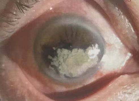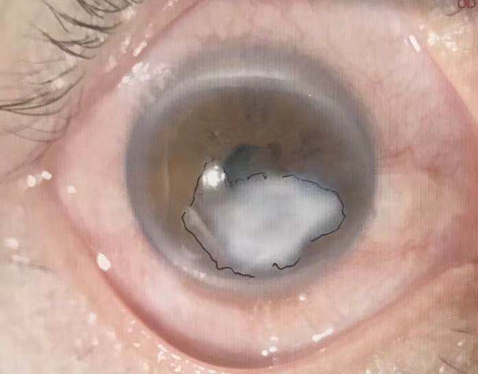 中央偏下方角膜上有一橫橢圓形的白色病灶,大小約為5*7mm,遮蓋大部分瞳孔區(qū)。