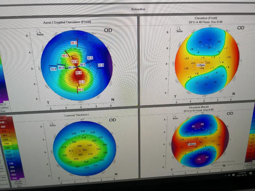 經(jīng)眼表及角膜病專(zhuān)科副主任醫(yī)師林志榮博士詳細(xì)檢查,小黃右眼視力0.4,左眼視力0.25,雙眼角膜中央?yún)^(qū)膨隆,變薄,呈錐形,結(jié)合角膜地形圖檢查分析數(shù)據(jù),確診為“雙眼圓錐角膜”,且已進(jìn)入臨床期,需要盡快安排手術(shù)。