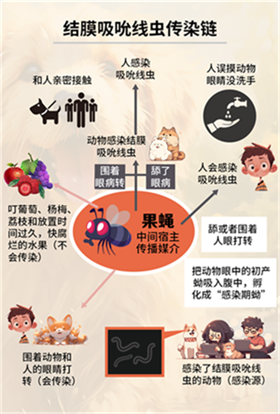 至于家中有養(yǎng)寵物的也不必?fù)?dān)心,結(jié)膜吸吮線蟲蟲源在傳播過程中需要果蠅作為“中間者”,野外動物感染結(jié)膜吸吮線蟲一般是因為果蠅在“食用”這些動物眼部分泌物的過程中,將蟲源傳播到這些動物的眼睛里,從而導(dǎo)致感染,所以大家不必因為家中寵物而擔(dān)憂,定期驅(qū)蟲即可。