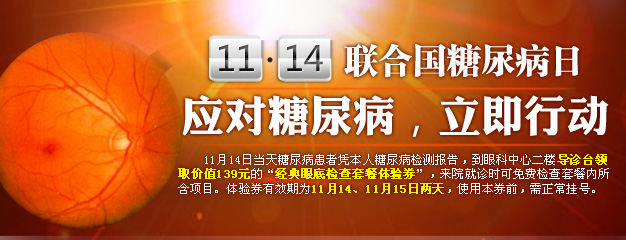 11月14日當(dāng)天糖尿病患者憑本人糖尿病檢測(cè)報(bào)告,到眼科中心二樓導(dǎo)診臺(tái)領(lǐng)取價(jià)值139元的"經(jīng)典眼底檢查套餐體驗(yàn)券",來(lái)院就診時(shí)可免費(fèi)檢查套餐內(nèi)所含項(xiàng)目。體驗(yàn)券有效期為11月14、11月15日兩天,使用本券前,需正常掛號(hào)。