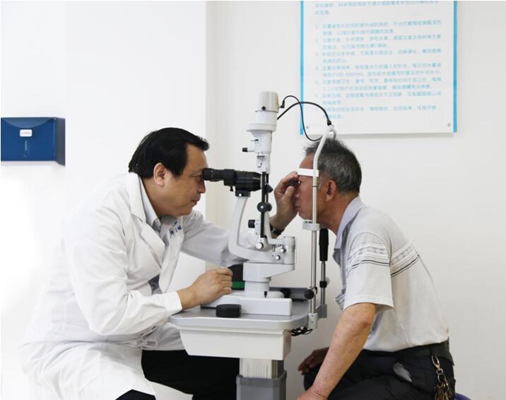 著名眼科專家盧奕教授為預(yù)約患者檢查眼睛