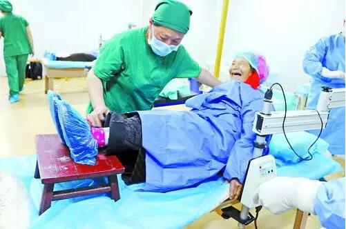 在西藏察隅,醫(yī)療隊拿來小凳子幫駝背的高齡藏民墊起腳,使其順利接受白內(nèi)障手術(shù)