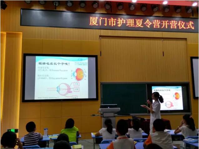 2016年07月05日風(fēng)和日麗、陽(yáng)光普照,由市教育局與市護(hù)理學(xué)會(huì)聯(lián)合舉辦的“2016年廈門市小學(xué)生護(hù)理夏令營(yíng)”活動(dòng)在翔鷺小學(xué)正式開營(yíng)了。為增強(qiáng)青少年愛(ài)眼護(hù)眼意識(shí),促使其養(yǎng)成保護(hù)視力、預(yù)防近視的良好習(xí)慣,廈門大學(xué)附屬?gòu)B門眼科中心護(hù)理組有幸受邀為本期夏令營(yíng)活動(dòng)傳授“關(guān)愛(ài)眼睛、預(yù)防近視”眼保健知識(shí)。本期夏令營(yíng)成員是翔鷺小學(xué)及鄰近學(xué)校四至五年級(jí)的學(xué)生,一共25名學(xué)生參加了本次活動(dòng),夏令營(yíng)活動(dòng)分三個(gè)環(huán)節(jié)進(jìn)行。