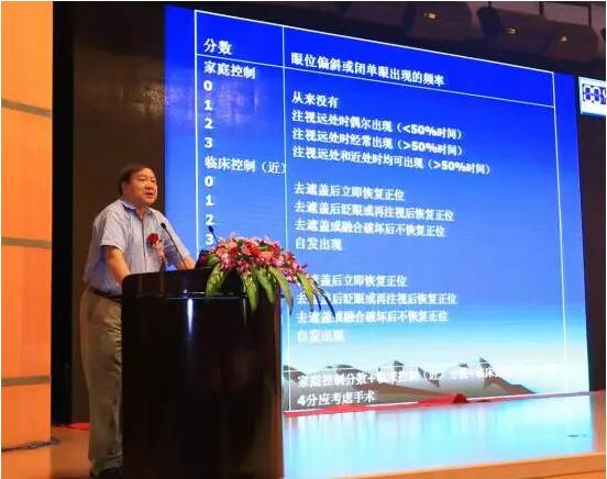 中華醫(yī)學會眼科學分會前任主任委員、中國醫(yī)師協(xié)會眼科醫(yī)師分會會長趙堪興教授在大會上做了關于“兒童常見斜視手術時機”的主題演講。趙教授認為,兒童常見斜視主要有三類:內斜視(ET)、外斜視(XT)、上斜肌麻痹(SOP)。在演講中,他和同仁分享了臨床了幾例疑難斜視病例的診斷過程、手術方案以及治療效果,并闡述兒童斜視早期干預是基于視覺發(fā)育規(guī)律決定的,具有豐富內涵不只是盡早手術。先天性內斜視破壞雙眼視覺發(fā)育,需2歲前完成,以爭取粗的立體視;間歇性外斜視宜在控制力明顯下降時手術,術前應能夠較準確檢查斜視角以減少破壞雙眼視的風險,3歲以前手術需慎重;先天性上斜肌麻痹需早期手術以保護雙眼視力,減少面部與脊柱發(fā)育畸形。