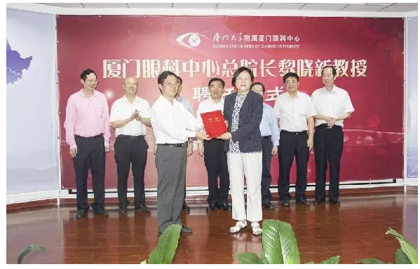 △ 今年5月,黎曉新教授(右)受聘為廈門眼科中心院長