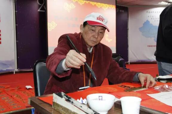 患友站在書法家對面,做幫手。小心翼翼地按住紅紙的一頭,在其寫完一字起筆蘸墨的瞬間,輕輕拉過一格,讓他寫第二個(gè)字。