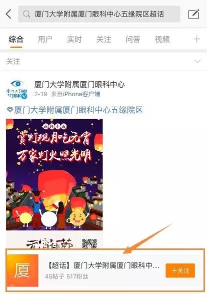 ①打開新浪微博,點擊“發(fā)現(xiàn)”,搜索“廈門大學附屬廈門眼科中心五緣院區(qū)”;