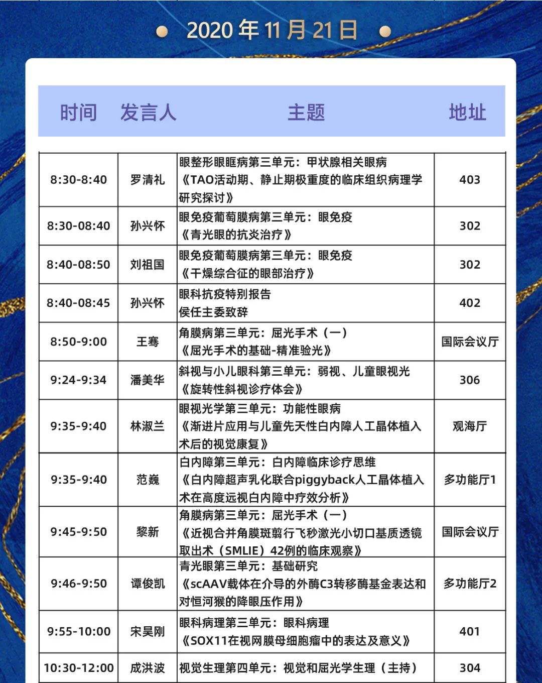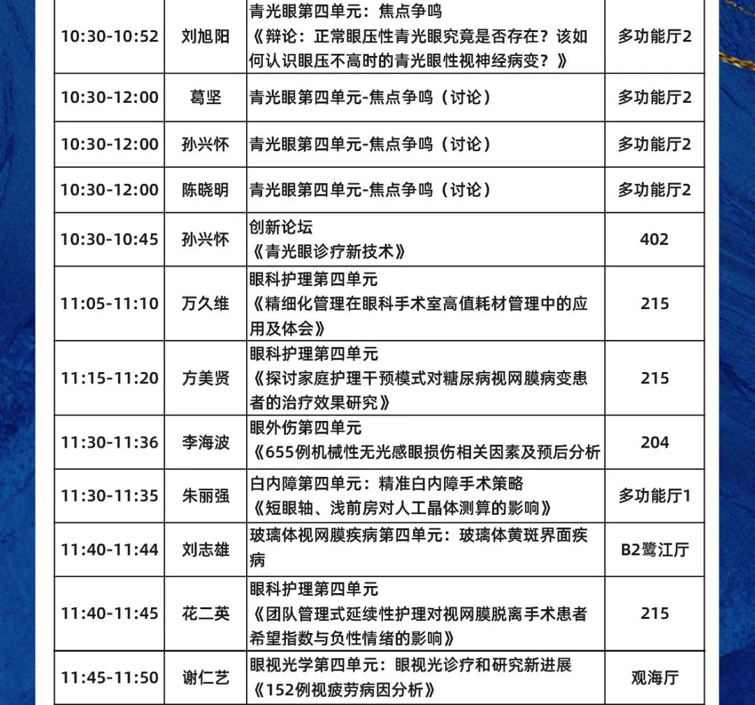 數(shù)十位廈門眼科中心專家受邀大會(huì)發(fā)言,涵蓋專題發(fā)言、論文發(fā)言、討論點(diǎn)評(píng)等。他們將圍繞眼科臨床診療新技術(shù)、新的防治措施以及科研、教學(xué)等方面的新進(jìn)展暢所欲言,多角度、多學(xué)科、多元化為眼科同道獻(xiàn)上一場(chǎng)學(xué)術(shù)盛宴。
