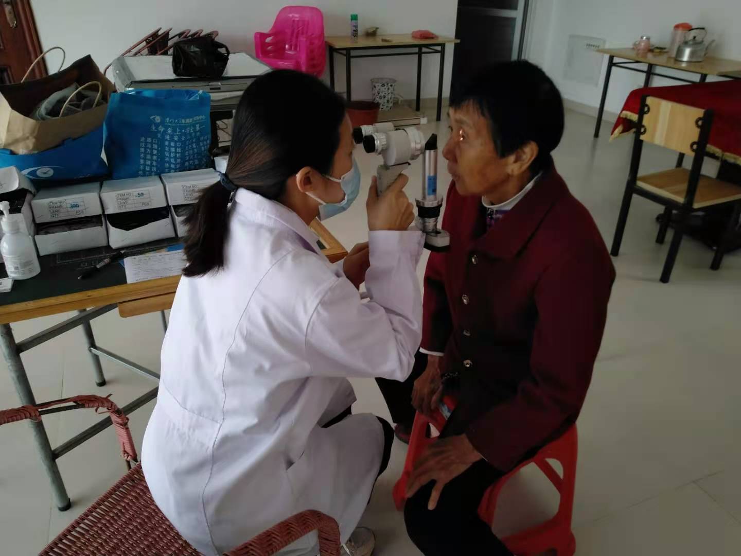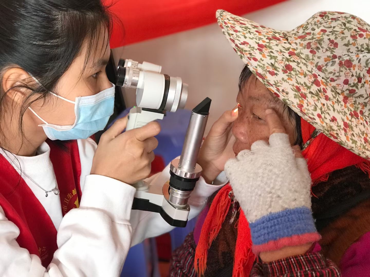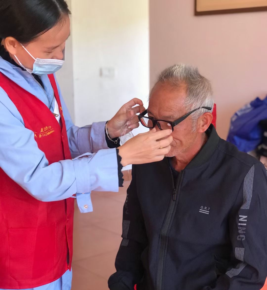 高山上的村莊,這里常見眼病主要為翼狀胬肉和白內(nèi)障。由于海拔較高,紫外線強度較大。強烈的紫外線照射,容易導(dǎo)致角膜緣干細胞的損害,引起細胞增殖,可能導(dǎo)致翼狀胬肉。另外,紫外線會加速晶狀體的老化,使晶狀體逐漸變混濁,易增加白內(nèi)障的患病幾率,導(dǎo)致白內(nèi)障的提前發(fā)生。專家們提醒村民要盡量避免紫外線照射、煙塵、風(fēng)沙的刺激,戶外活動可以佩戴太陽鏡等護眼工具。