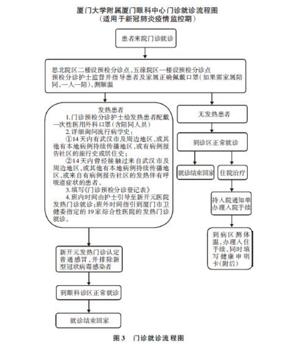 2019年12月以來新型冠狀病毒肺炎疫情迅速蔓延,面對這種傳染性極強的新冠病毒,眼科醫(yī)護人員應(yīng)該在救治眼科患者的同時做好醫(yī)患人員的防護。下面就廈門眼科中心根據(jù)衛(wèi)生健康委的要求(圖1,2)在疫情期間開診過程結(jié)合眼科的特點制定并不斷完善了這些流程,供眼科同道參考。