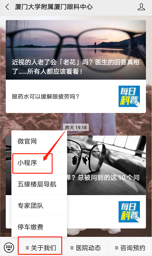在微信小程序中搜索“廈門眼科中心”,或在微信公眾號點(diǎn)擊“小程序”進(jìn)行自助預(yù)約。