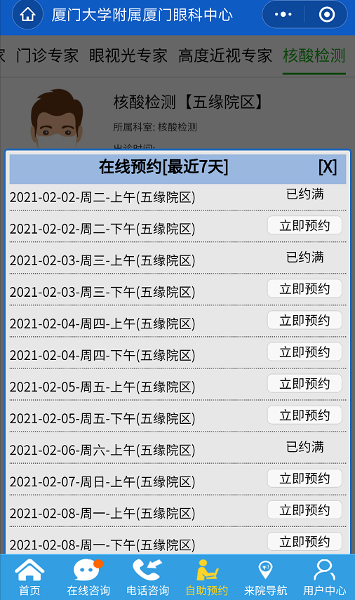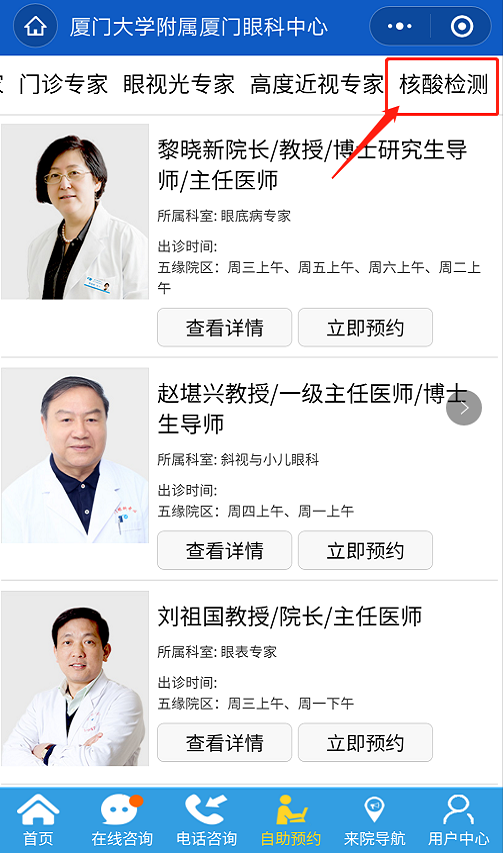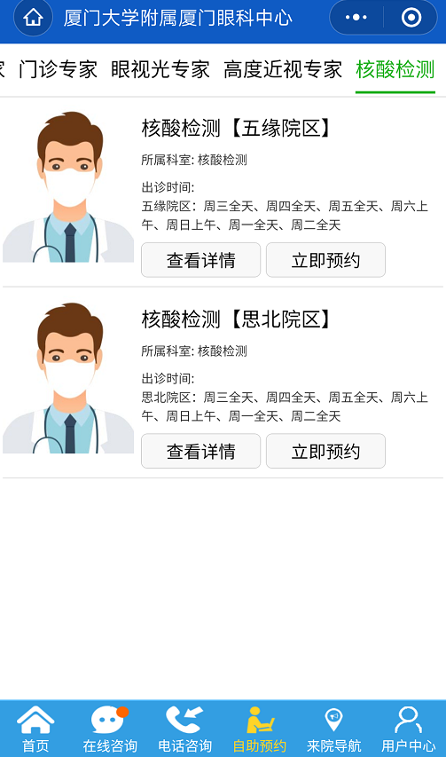 為了更好地滿足廣大市民需求,廈門眼科中心提供核酸檢測服務(wù),同時可以在線上自助預(yù)約核酸檢測啦!