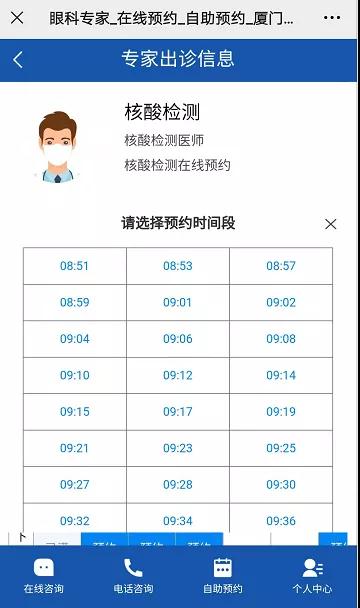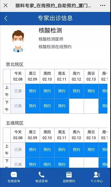 預(yù)約步驟:預(yù)約到診-核酸檢測(cè)預(yù)約-醫(yī)療機(jī)構(gòu)(廈門(mén)大學(xué)附屬?gòu)B門(mén)眼科中心)-選擇思北/五緣院區(qū)-選擇時(shí)間預(yù)約