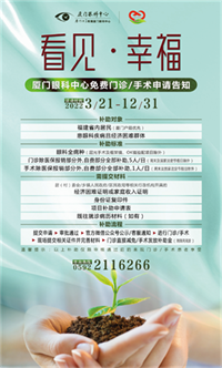 眼睛是心靈之窗,眼健康是國民健康的重要組成部分,也是反映人民群眾健康和幸福指標的一面鏡子。為深化落實“愛心廈門”行動及內涵,提升人民群眾的獲得感、幸福感、安全感,滿足普遍、多樣的眼健康需求,2022年3月21日至12月31日,廈門眼科中心暖心啟動2022年“看見幸福”眼健康愛心公益項目,聚焦弱勢群體及重點眼病的困難救治,凡符合條件的患者均可申請專項愛心公益補助。