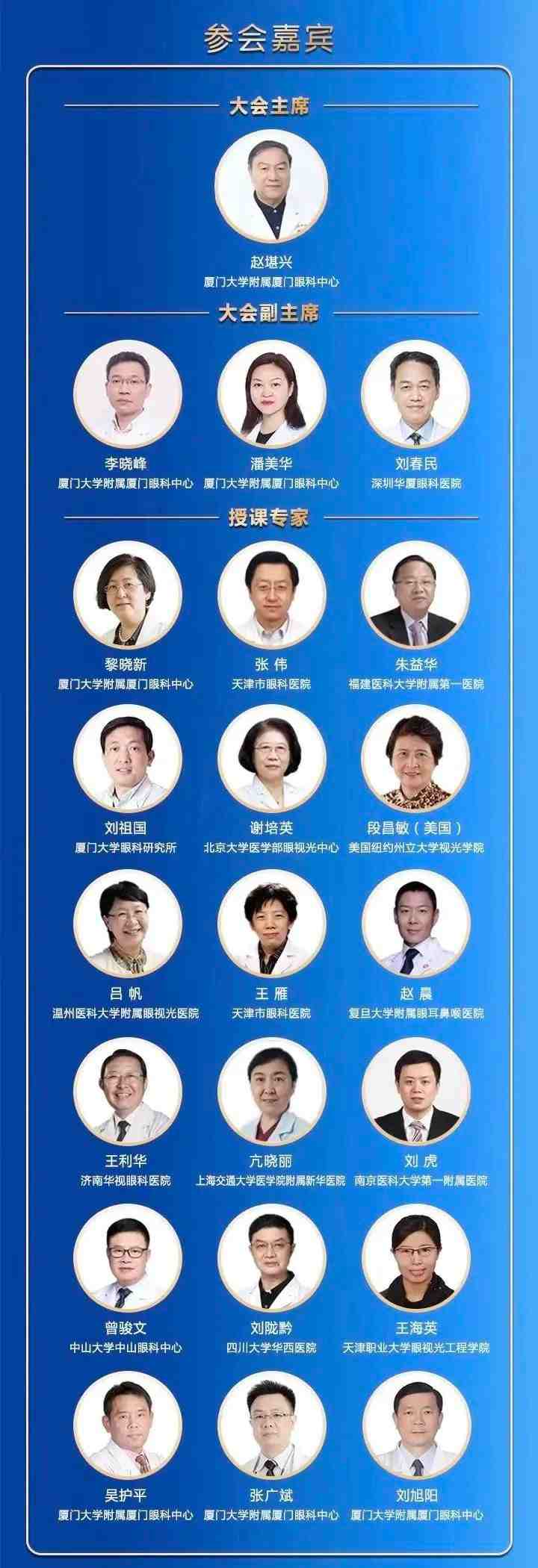 授課專家包括國(guó)際眼科科學(xué)院院士、亞太地區(qū)斜視與小兒眼科學(xué)會(huì)副主席趙堪興教授;國(guó)際眼科科學(xué)院院士、廈門眼科中心總院長(zhǎng)黎曉新教授;中華醫(yī)學(xué)會(huì)眼科學(xué)分會(huì)斜視與小兒眼科學(xué)組組長(zhǎng)張偉教授;中華醫(yī)學(xué)會(huì)眼科學(xué)分會(huì)眼視光學(xué)組組長(zhǎng)呂帆教授;以及朱益華教授、劉祖國(guó)教授、王利華教授、段昌敏教授(美國(guó))、謝培英教授、王雁教授、亢曉麗教授、趙晨教授、劉虎教授、劉隴黔教授、曾駿文教授、潘美華教授、張廣斌教授、吳護(hù)平教授、劉旭陽(yáng)教授、王海英教授等重量級(jí)業(yè)界專家和講者。