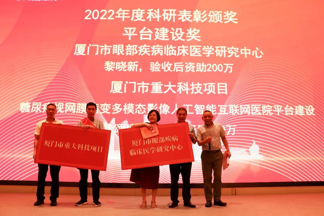 會(huì)上,2022年度科研表彰頒獎(jiǎng)盛典同步舉行。2022年度,我院科研工作再結(jié)碩果,醫(yī)院學(xué)術(shù)品牌的影響力和號(hào)召力得到進(jìn)一步提升。我院獲批成為廈門市眼部疾病臨床醫(yī)學(xué)研究中心,榮登2022年度中國醫(yī)院科技量值(眼科學(xué))榜單,并連續(xù)十年衛(wèi)冕福建省眼科學(xué)第 一,實(shí)力領(lǐng)跑。