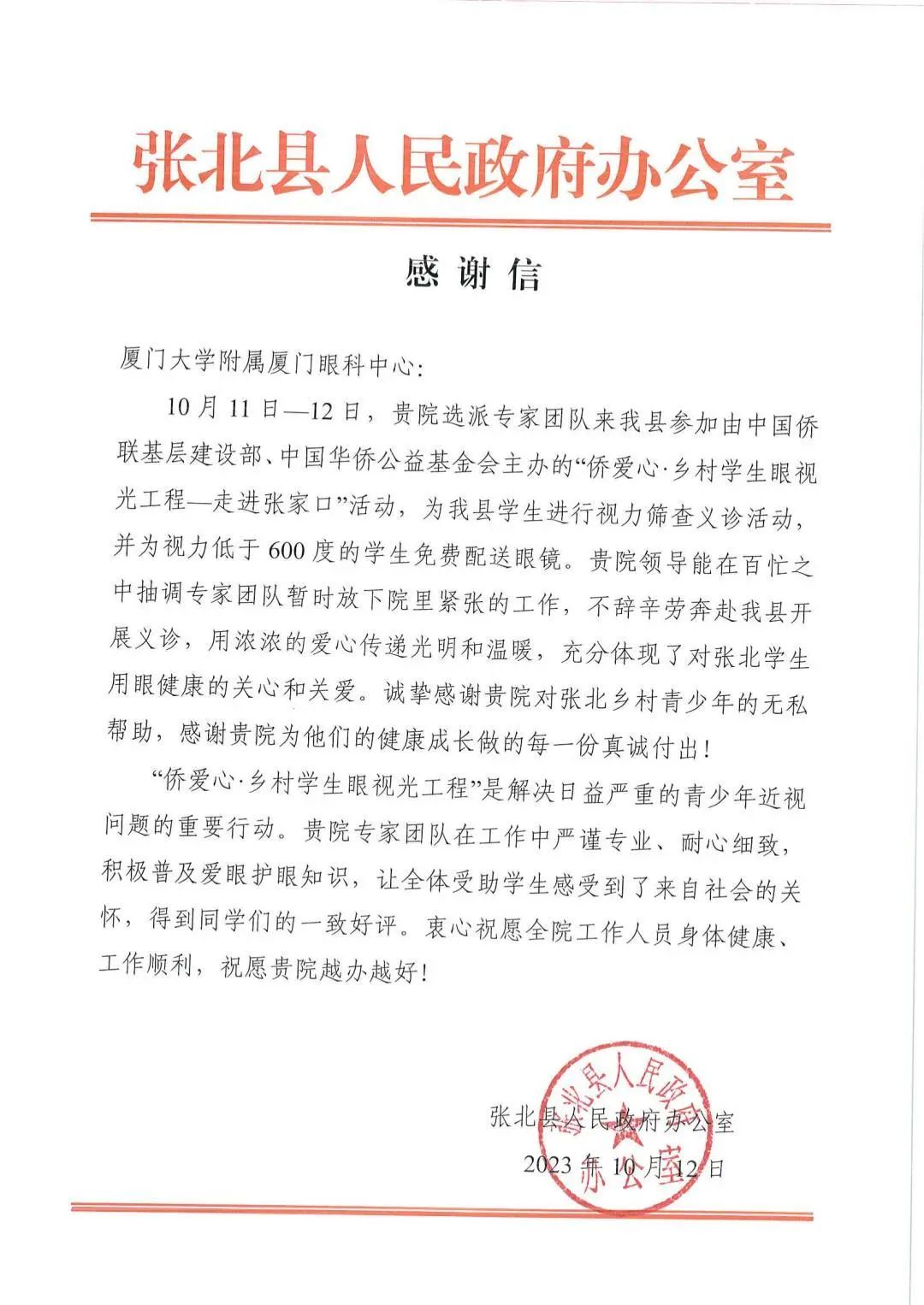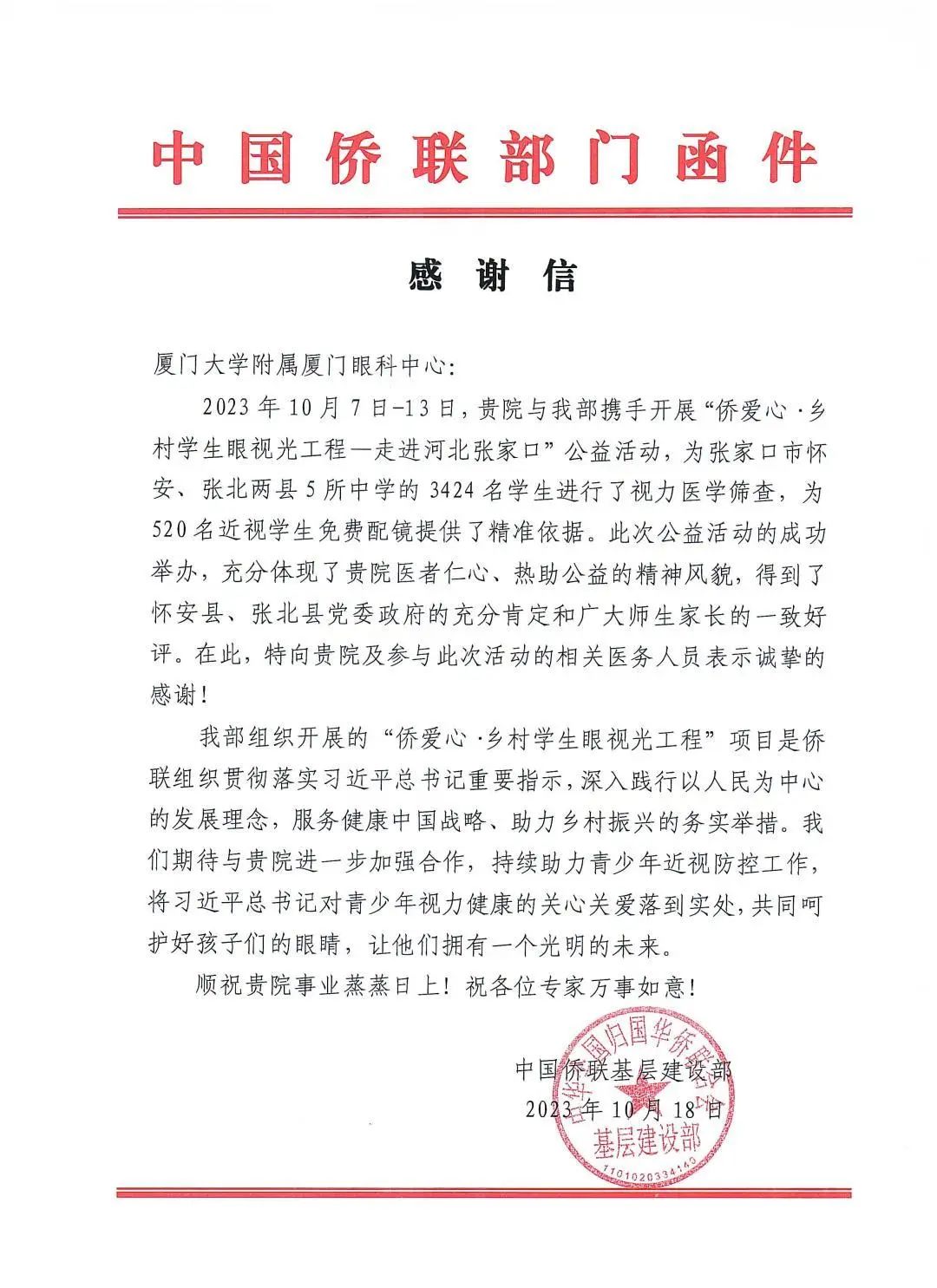 近日,廈門眼科中心接連收到來自中國僑聯(lián)基層建設(shè)部、懷安縣和張北縣人民政府辦公室的三封感謝信,信中對廈門眼科中心在“僑愛心·鄉(xiāng)村學(xué)生眼視光工程-走進河北張家口”公益活動中的無私付出及對鄉(xiāng)村孩子的寶貴的幫助給予充分認(rèn)可與真摯感謝。