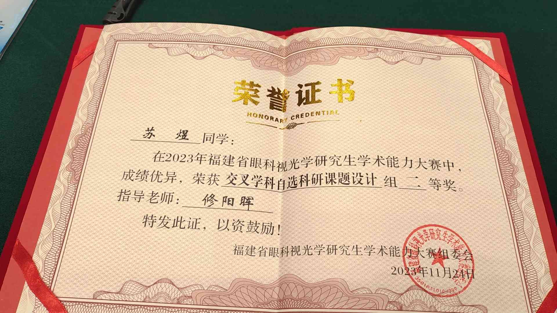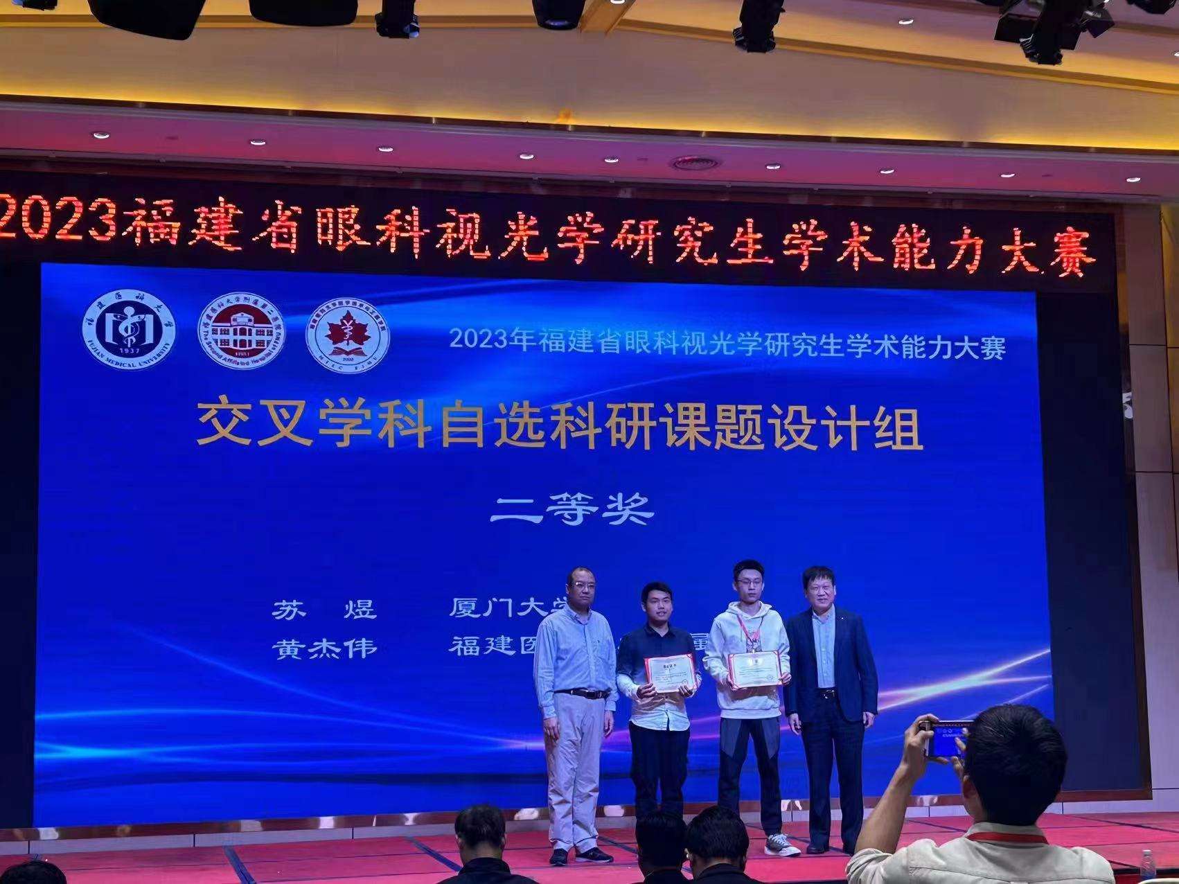 廈門眼科中心斜視與小兒眼病中心修陽暉博士指導的2023級專業(yè)型碩士研究生蘇煜代表廈門大學參賽,以嚴謹?shù)目蒲兴悸放c臨床思維,展現(xiàn)出良好的精神風貌和綜合素質,獲得在場的專家評委一致好評,最終以總分全省第二的好成績斬獲“交叉學科自選課題組二等獎”。