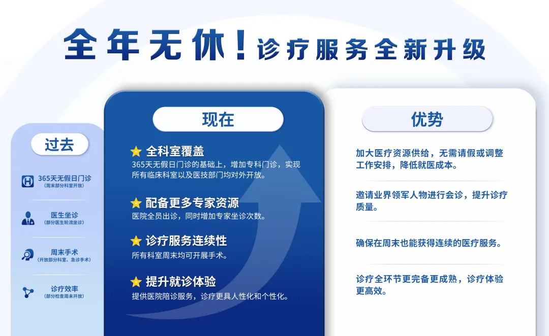 通過實施“無假日門診,診療再升級,周末開通門診”的組合方案,醫(yī)院可以在時間和服務(wù)質(zhì)量上雙重提升,確?;颊咴谌魏螘r間都能獲得高質(zhì)量的醫(yī)療服務(wù)。這不僅提高了患者的就診體驗,也增強了醫(yī)院的整體競爭力和服務(wù)水平,真正實現(xiàn)就醫(yī)無障礙,看病無需再請假,周末也能看醫(yī)生!