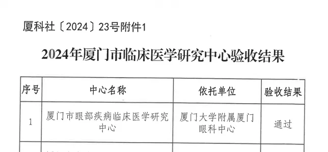 閃耀香江,放眼未來【文章導(dǎo)讀】日前,廈門市科學(xué)技術(shù)局對廈門市5家疾病臨床醫(yī)學(xué)研究中心開展了驗收,經(jīng)過層層嚴格評選、現(xiàn)場答辯和實地考察后,我院建設(shè)的眼部疾病臨床醫(yī)學(xué)研究中心成功通過驗收! 廈門市眼