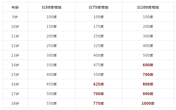 【文章導(dǎo)讀】一個(gè)孩子從近視發(fā)展到高度近視需要多久時(shí)間呢? 我們來做一個(gè)假設(shè),如果一個(gè)9歲的孩子近視100度,分別以每年50度、75度、100度的近視度數(shù)增長(zhǎng),結(jié)果竟然不到18歲,就已經(jīng)發(fā)展成了