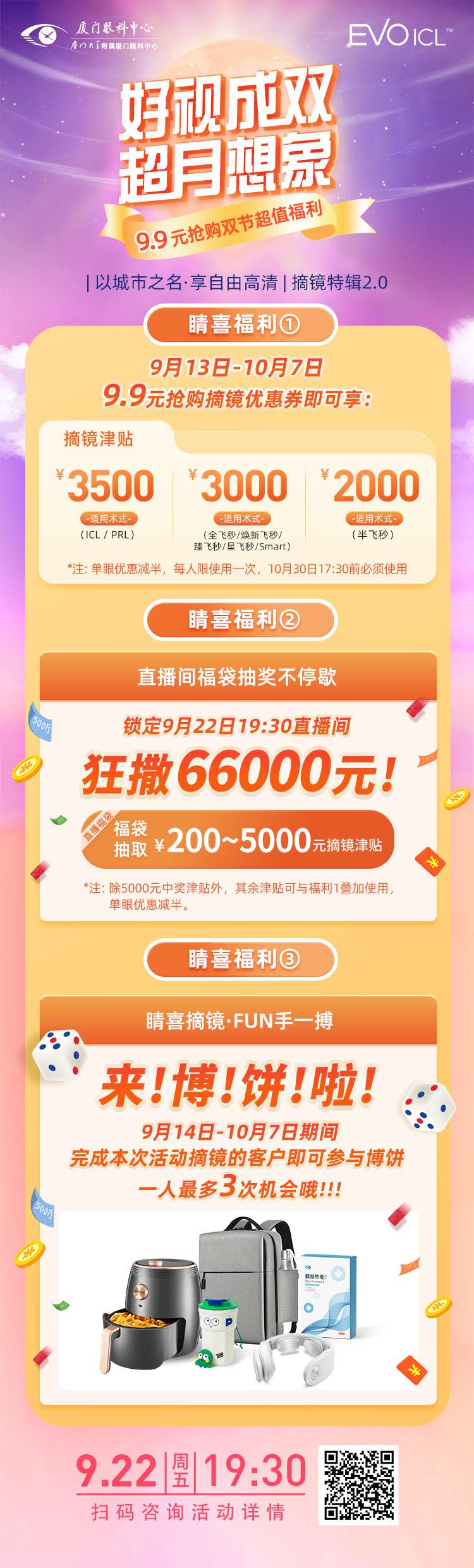 9月22日19:30,鎖定直播間,福袋抽不停,狂撒66000元摘鏡津貼,至高可得至高5000元摘鏡津貼。