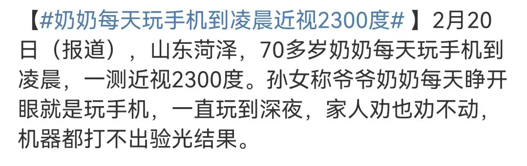 2月20日,山東菏澤發(fā)生了一起引人關注的健康事件:一位70多歲的老奶奶因長時間沉迷手機,導致近視度數竟高達2300度。
