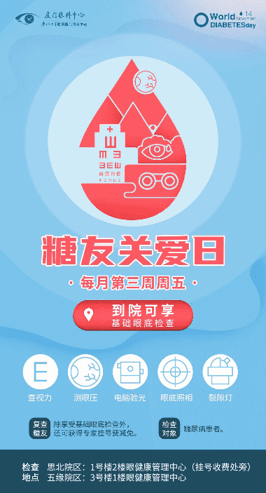 廈門眼科中心設(shè)立糖友關(guān)愛(ài)日,以倡導(dǎo)早檢查、早發(fā)現(xiàn)、早治療、長(zhǎng)期隨診為核心,為糖尿病患者及其家屬建立眼健康檔案,并提供控糖指導(dǎo)、眼健康篩查、慢病跟蹤管理等專業(yè)診療服務(wù),從而保障糖尿病患者的視覺(jué)質(zhì)量,從根本上降低糖尿病的致盲率。