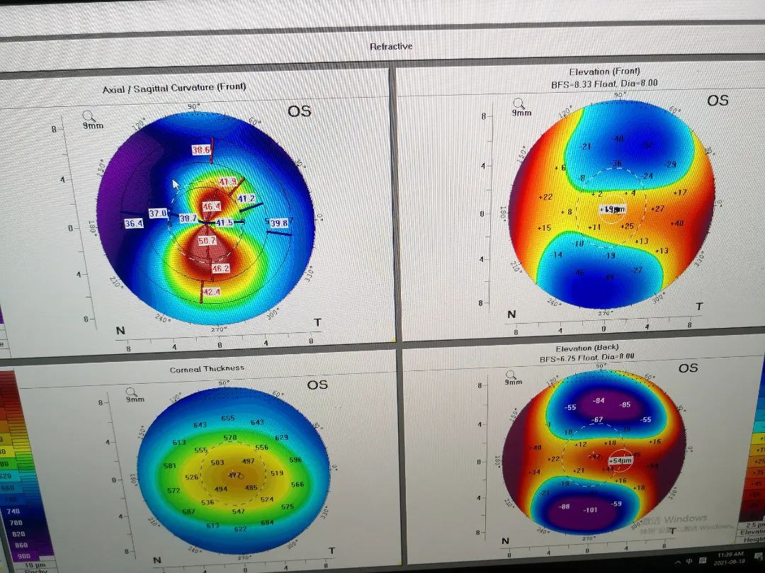 圓錐角膜早期病變表現為角膜表面異常隆起,角膜地形圖可以體現角膜表面形態(tài),它能夠精確測量分析全角膜表面任意點的曲率、厚度、形態(tài),及時發(fā)現角膜形態(tài)是否異常。